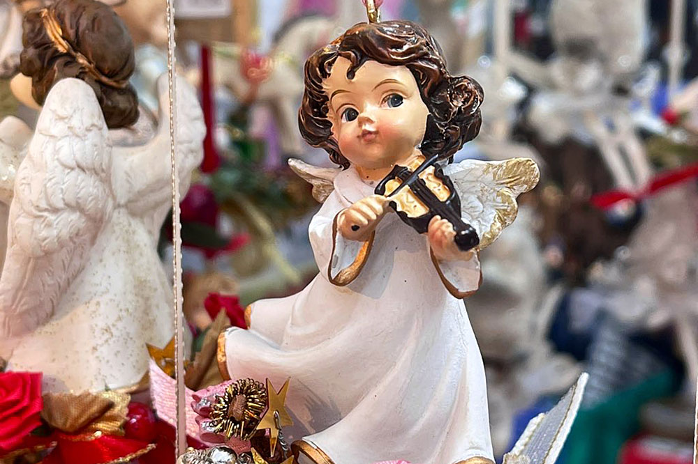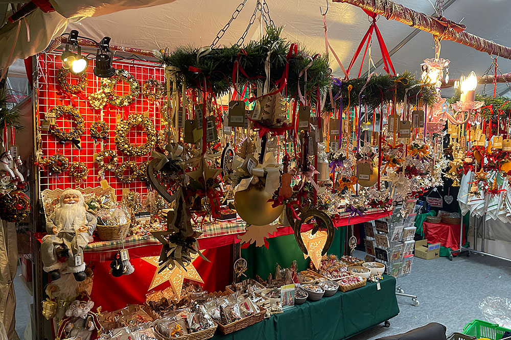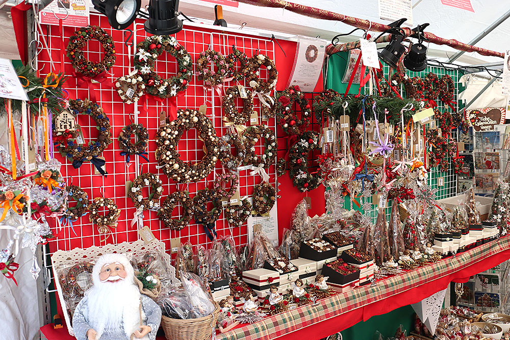ツリーが飾られ、くるみ割り人形やクッキー、焼きソーセージ、衣料品など、さまざまな屋台が立ち並び、多くの人々で賑わいます。
