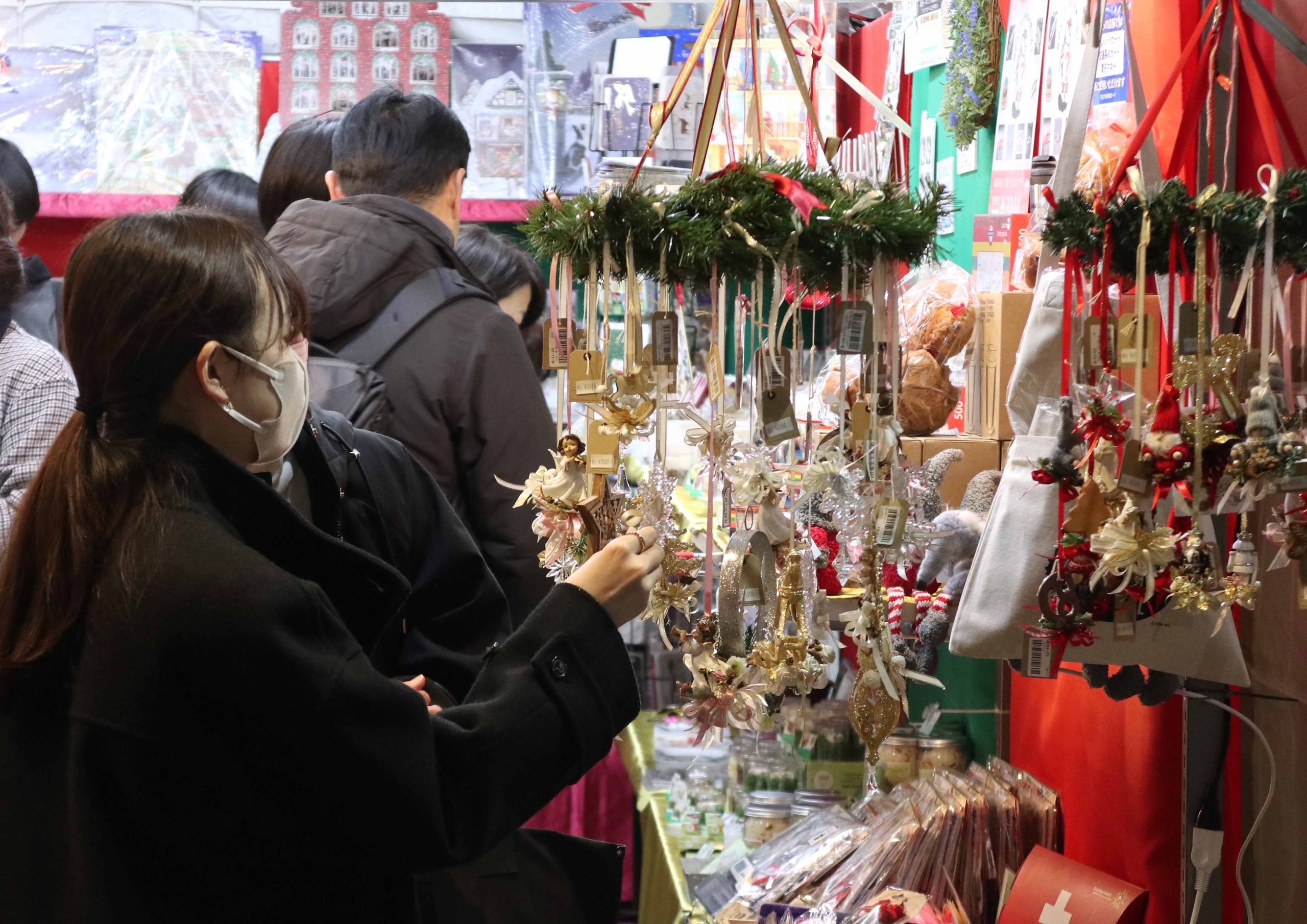 ツリーを飾り、くるみ割り人形やクッキー、焼きソーセージ、衣料品などを販売する様々な屋台が並び、たくさんの人々が訪れ賑わいます。